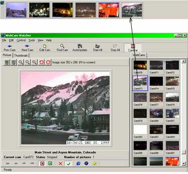 CamBar ของ Webcam Watcher จะช่วยให้ท่านสามารถเก็บกล้องที่ท่านโปรดปรานไว้บนจอ ในลักษณะเดียวกันกับแถบงานหรือทาสก์์บาร์ของ Windows